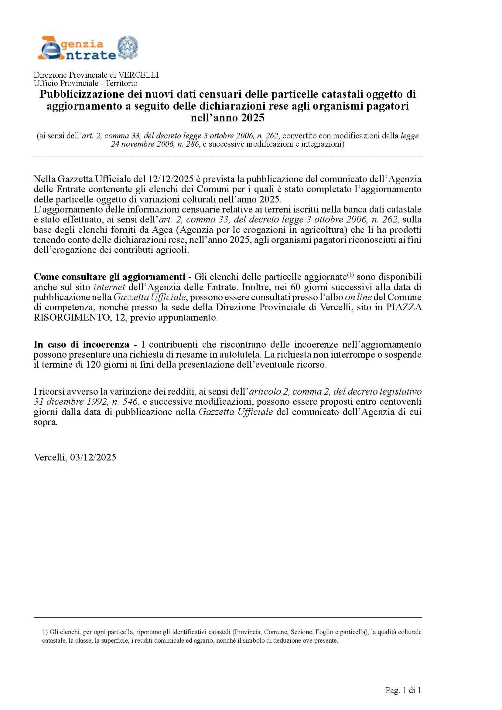 Gli elenchi delle particelle aggiornate sono disponibili anche sul sito Internet dell'Agenzia delle Entrate, presso l'Albo on line di questo Ente, nonchè presso la sede della Direzione Provinciale di Vercelli, previo appuntamento.