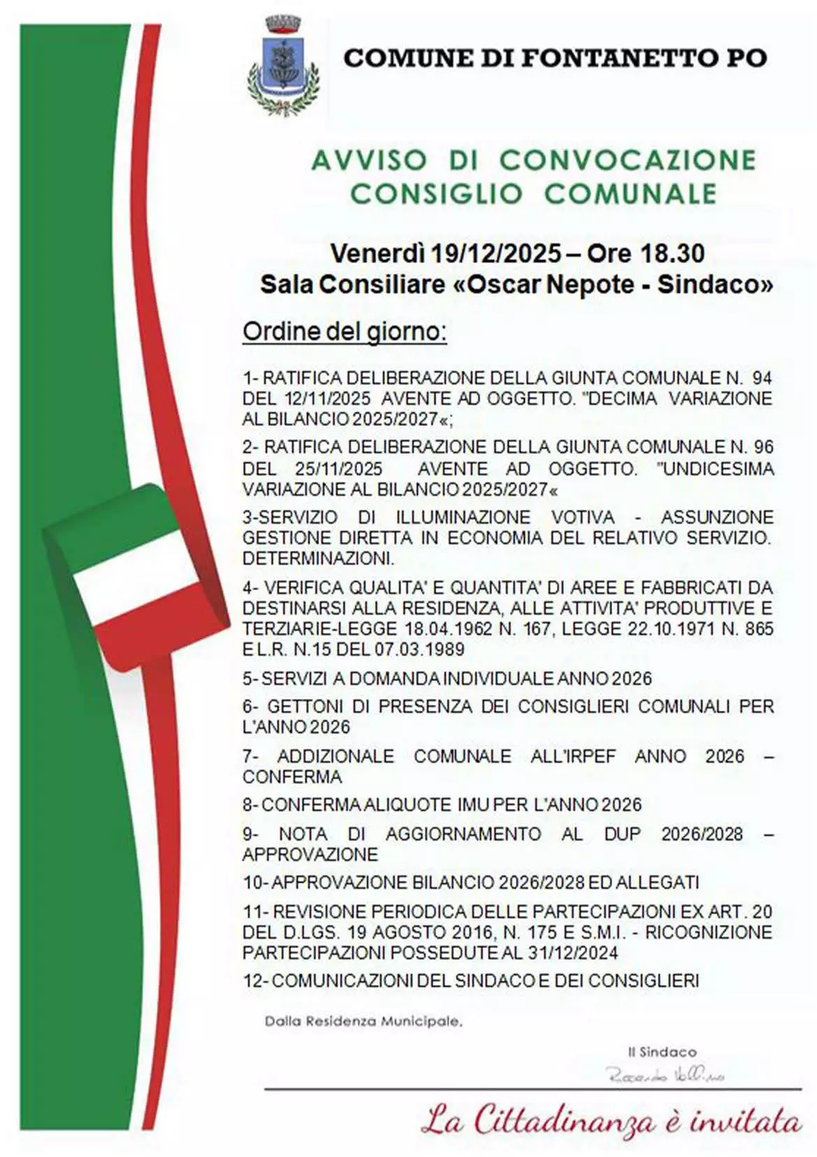 Descrizione CONVOCAZIONE DEL CONSIGLIO COMUNALE ORE 18.30 VENERDI' 19 DICEMBRE 2025 PALAZZO COMUNALE - SALA CONSILIARE "OSCAR NEPOTE - SINDACO" in allegato l'Ordine del giorno