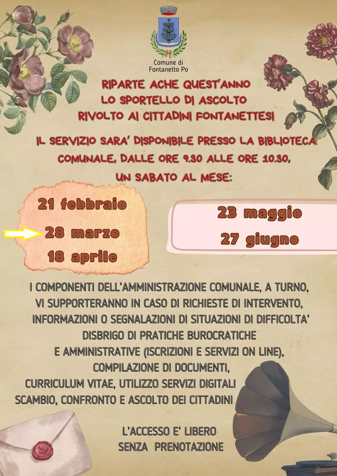 Descrizione SABATO 28 MARZO ORE 9.30 - BIBLIOTECA COMUNALE LO SPORTELLO DI ASCOLTO GLI AMMINISTRATORI COMUNALI SARANNO A DISPOSIZIONE DEI CITTADINI PER INFORMAZIONI, AIUTO PER DISBRIGO PRATICHE BUROCRATICHE E AMMINISTRATIVE, E MOLTO ALTRO